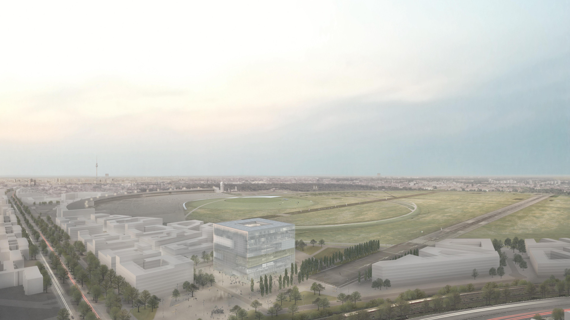 Preisgekrönter Wettbewerbsbeitrag für die Staatsbibliothek auf dem ehemaligen Flugfeld Tempelhof in Berlin.