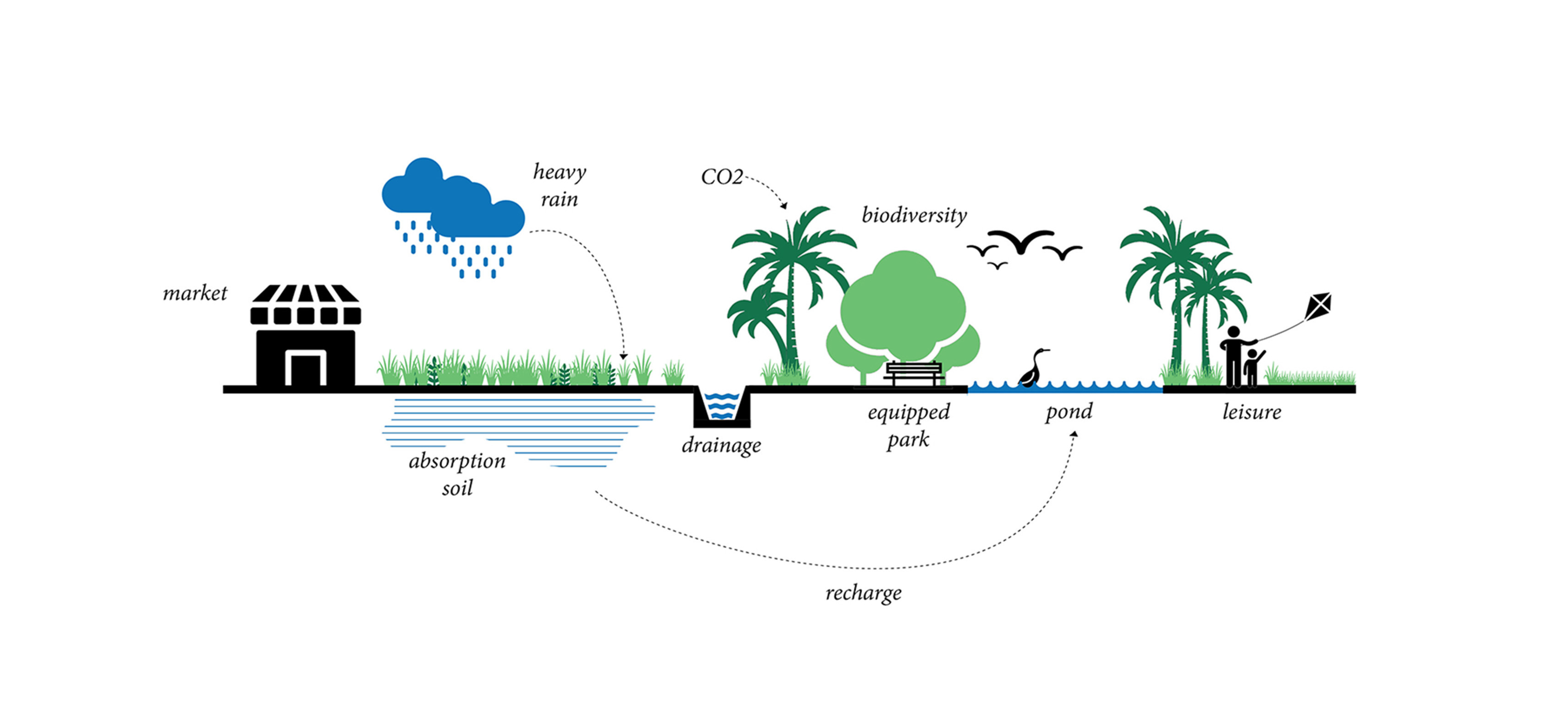 Der Ansatz besteht darin, alle städtischen Komponenten des GCDP nachhaltig in die Planung und Gestaltung städtischer Projekte zu integrieren: Wasser, feste Abfälle, Energie, Verkehr, Wirtschaft, Freiraum und Gemeinschaft. Ausgehend von einem Verständnis des sozioökonomischen, geographischen, kulturellen und historischen Kontexts der Stätte wird ein räumlicher Rahmen definiert, der alle Interventionen zu einer leicht verständlichen Erzählung verbindet. Diese innovative Perspektive bringt mehrere Ergebnisse und Vorteile mit sich. Es sieht einen Punkt am Horizont für ein umfassendes und belastbares Projekt und lädt alle Beteiligten ein, sich daran zu beteiligen. Die Wirkung jedes Projekts wird vervielfacht, und diese Effizienz ist das Rückgrat, das den Ecodistrict definiert.