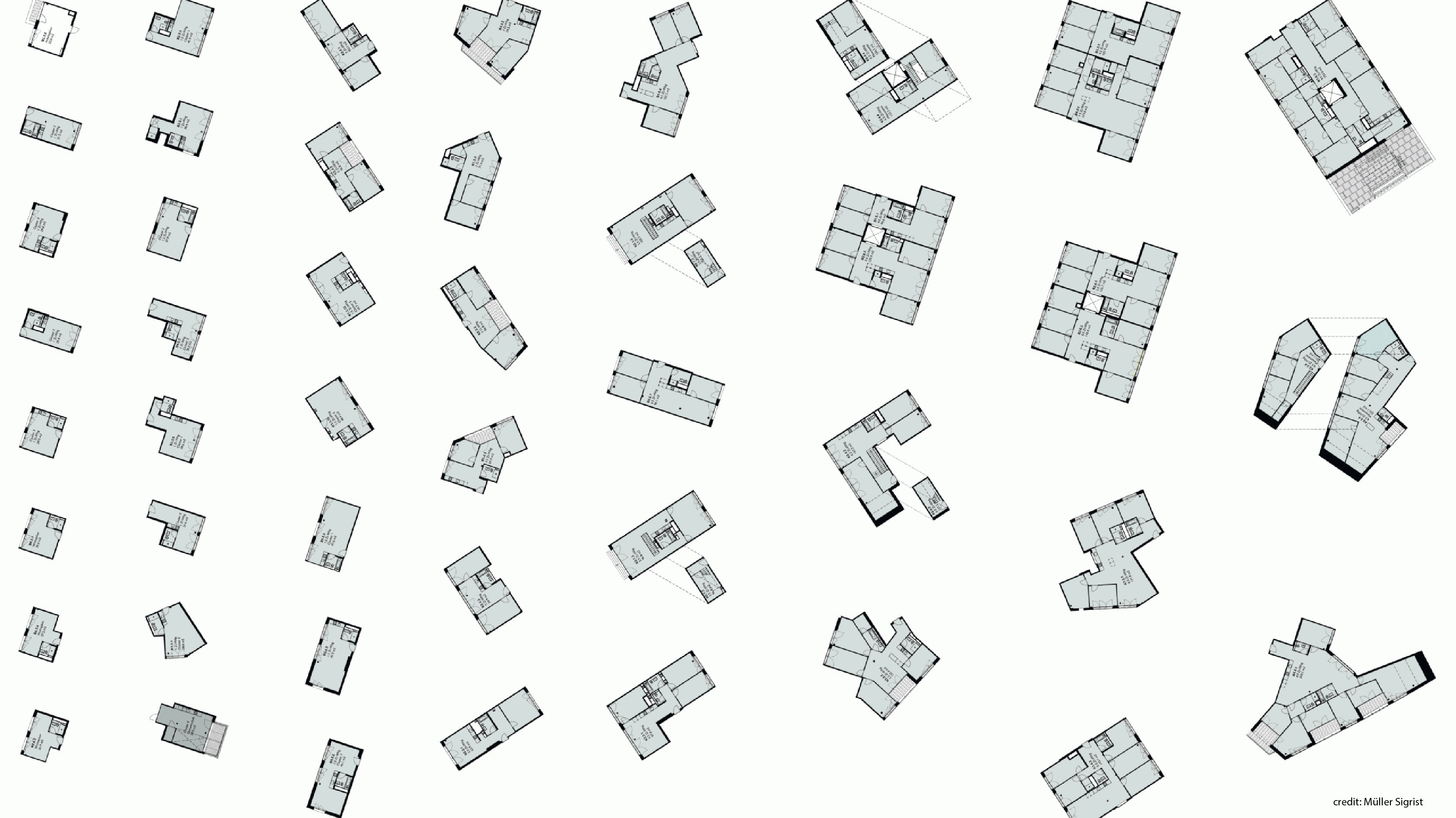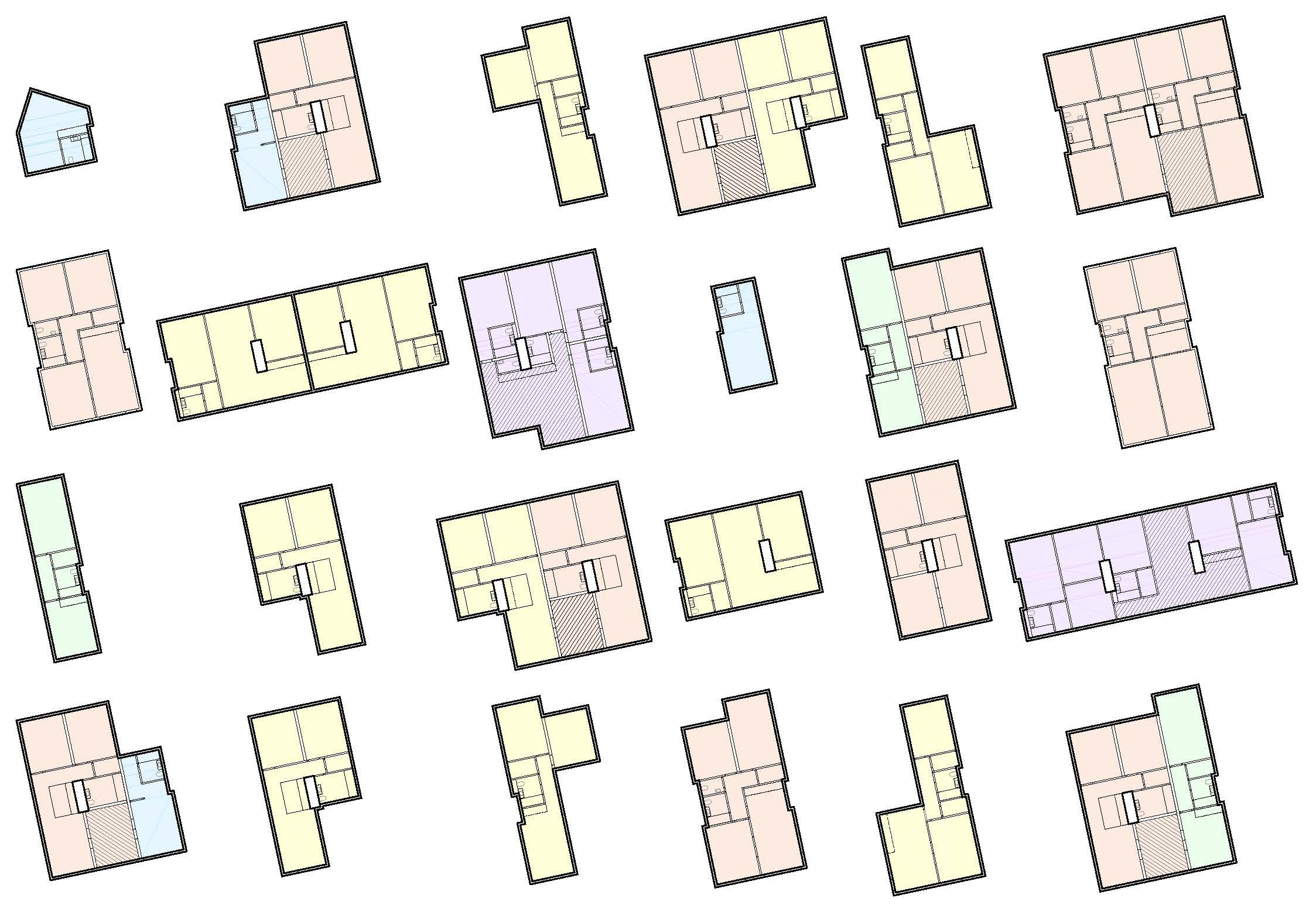 The housing typologies within the project are based on the principles of flexible (adaptation of apartments, customisable, multifunctional rooms, floor plan variety), fair (simple/modular construction, self-built, easy standards, minimisation of private space), together (innovative forms of living, communal outdoor spaces, communal indoor spaces, special equipment), and responsible (ecological/innovative design, integration of commercial/cultural uses, creation of public space)